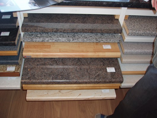 Kaklet är i alla fall på plats nu. På plats, så till vida att vi har hämtat ut det och kan sitta och begrunda de tjusiga mosaikrutorna varje dag, i kartongen. Den gångna helgen var det så äntligen dags att välja bänkskiva. Ännu ett fantastiskt bemötande av kunniga människor. Vi ville gärna ha en skiva i sten men snabbt gick det upp för oss att det faktiskt fanns fantastiska, konstgjorda bänkskivor som var både billigare och inte alls lika känsliga för eventuella fläckar.