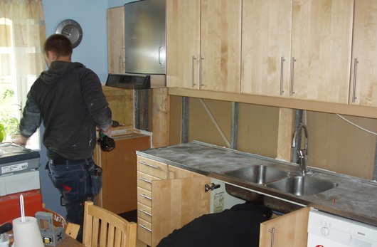 Det är tur att det finns hantverkare som kan rycka ut med kort varsel. Nästa förmiddag kom snickaren med cirkelsåg och nya gipsskivor. Vad vi inte tänkt på var att, för att få bort diskbänken, måste vattnet stängas av. Det blev ytterligare ett samtal, denna gång till en rörläggare. Med hjärtat i halsgropen blev vi tvungna att bevittna hur rörläggaren stänger av vattnet och pluggar igen rören, samtidigt som snickaren river ut diskbänken och sätter upp nya gipsskivor.